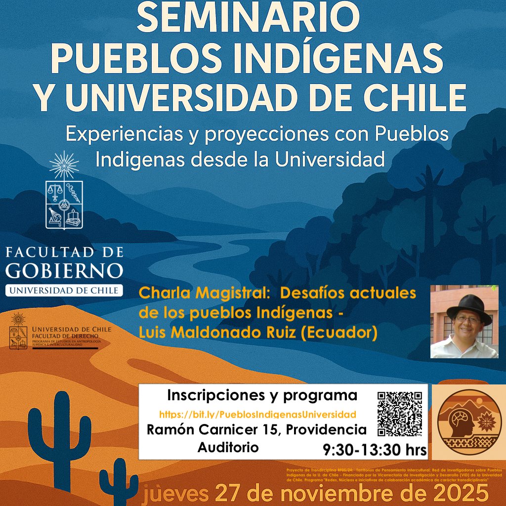 La Facultad de Gobierno tiene el agrado de invitar a la comunidad universitaria y al público interesado a participar en el Seminario "Pueblos Indígenas y Universidad de Chile", un espacio clave para reflexionar sobre las experiencias y los futuros desafíos de la relación entre la academia y los pueblos originarios.