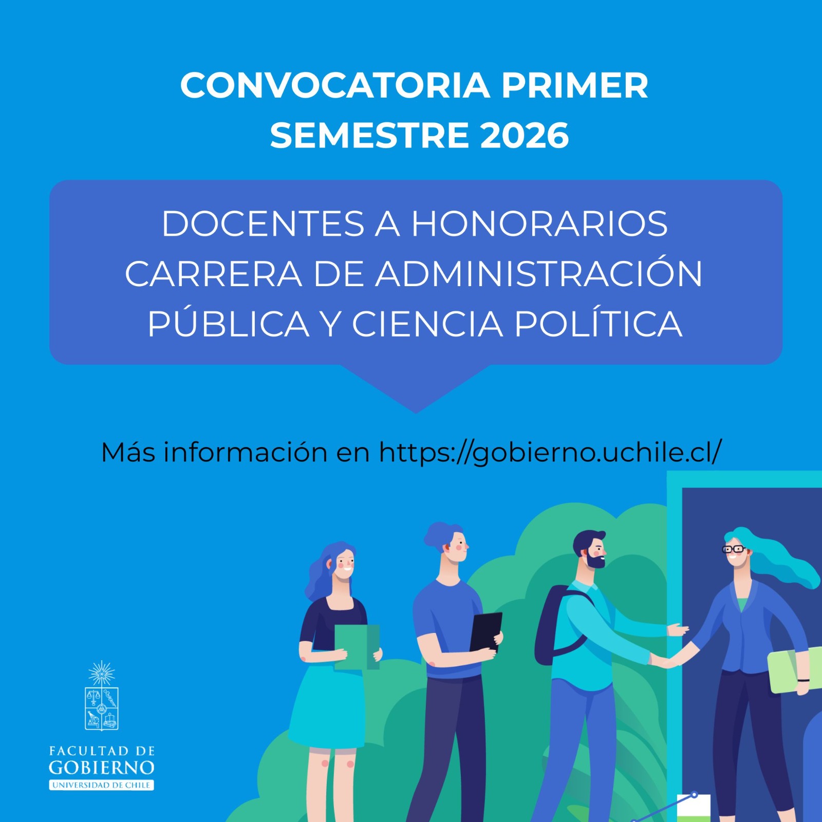 Las carreras de Administración Pública y Ciencia Política llaman a convocatoria para realizar docencia durante el semestre otoño (primer semestre) del año 2026, en modalidad convenio de prestación de servicios a honorarios, en conformidad con lo señalado en el artículo 11 del Estatuto Administrativo y del artículo 59 del Estatuto de la Universidad de Chile. Los cursos serán impartidos con un enfoque pedagógico basado en el desarrollo de competencias, por lo que se requiere que los/las postulantes se adhieran a este modelo educativo.