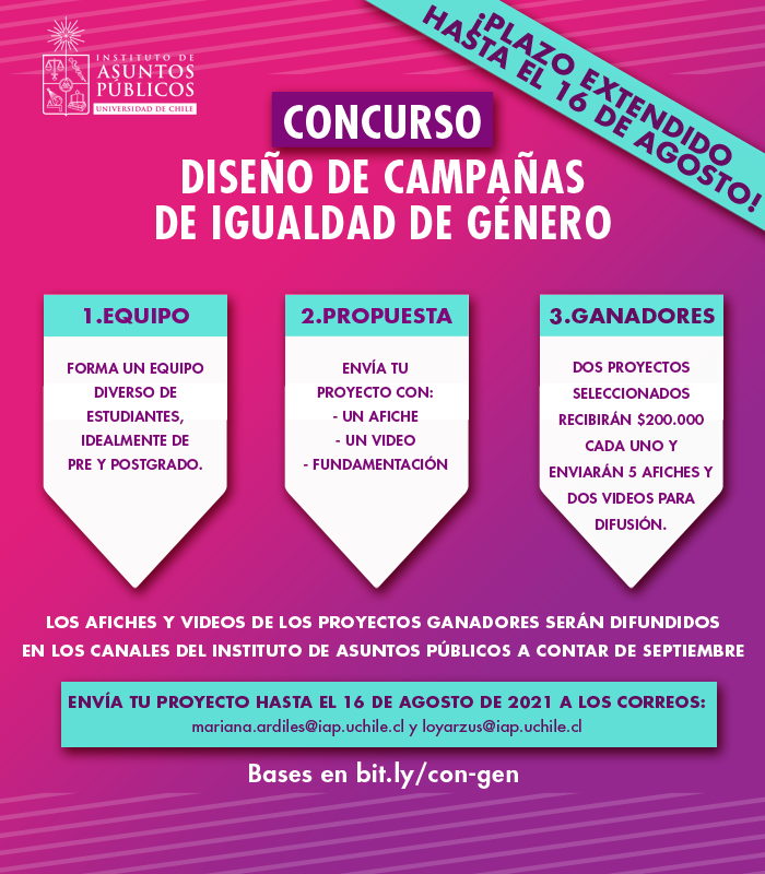 La Coordinación de Equidad de Género del Instituto de Asuntos Públicos de la Universidad de Chile llama a sus estudiantes de pre y postgrado a participar en el Concurso Campaña de Igualdad de Género, y anuncia la extensión del plazo para concursar hasta el lunes 16 de agosto.