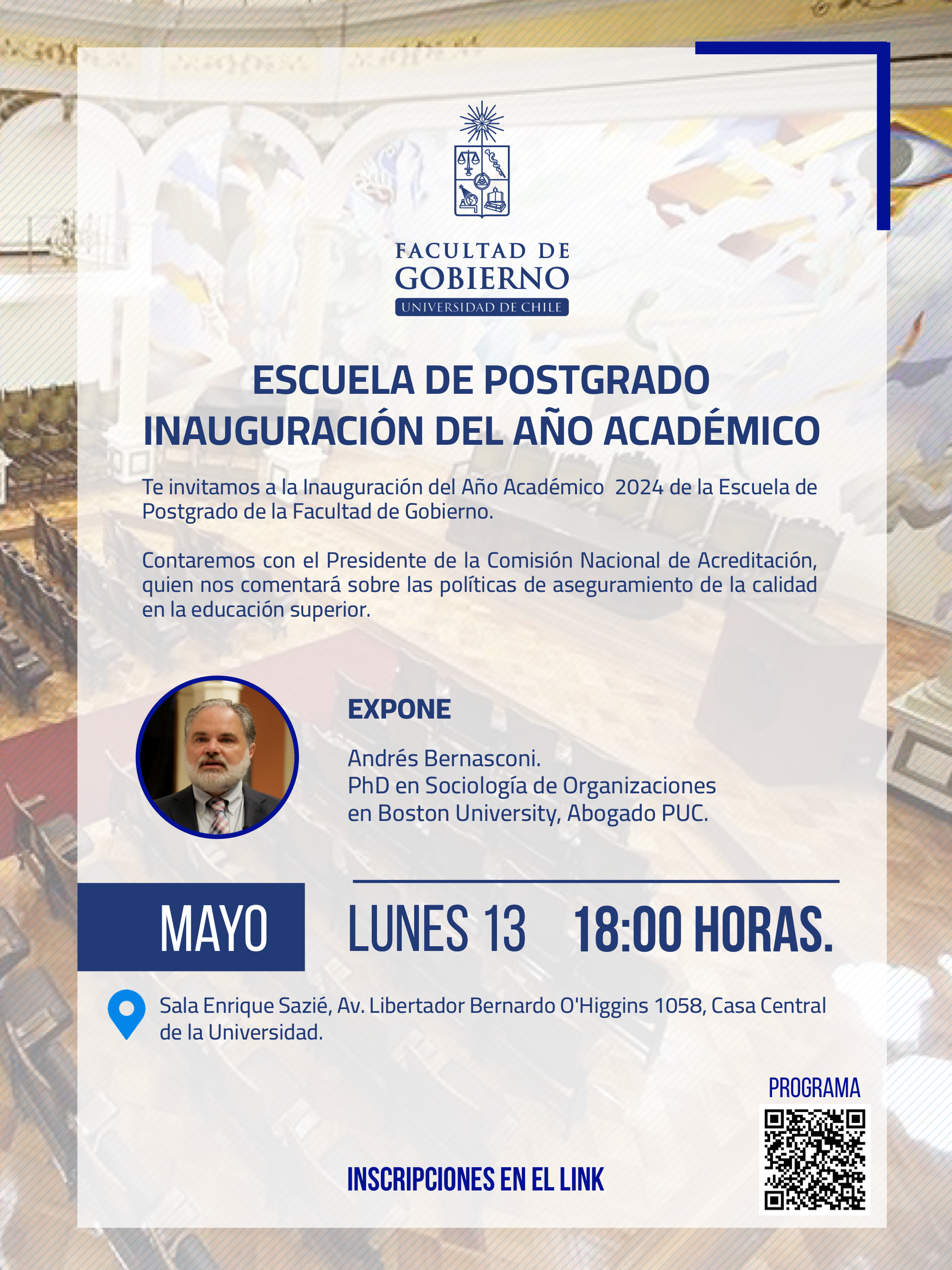 Finalmente, cabe destacar que el lunes 13 de mayo, a las 18:00h. en la Sala Enrique Sazié de la Casa Central de la Universidad de Chile (Av. Libertador Bernardo O'Higgins 1058), se realizará la Inauguración del Año Académico de la Escuela de Postgrado de la Facultad de Gobierno de la Universidad de Chile, en la que expondrá Andrés Bernasconi, Presidente de la Comisión Nacional de Acreditación, quien comentará sobre las políticas de aseguramiento de la calidad en educación superior.