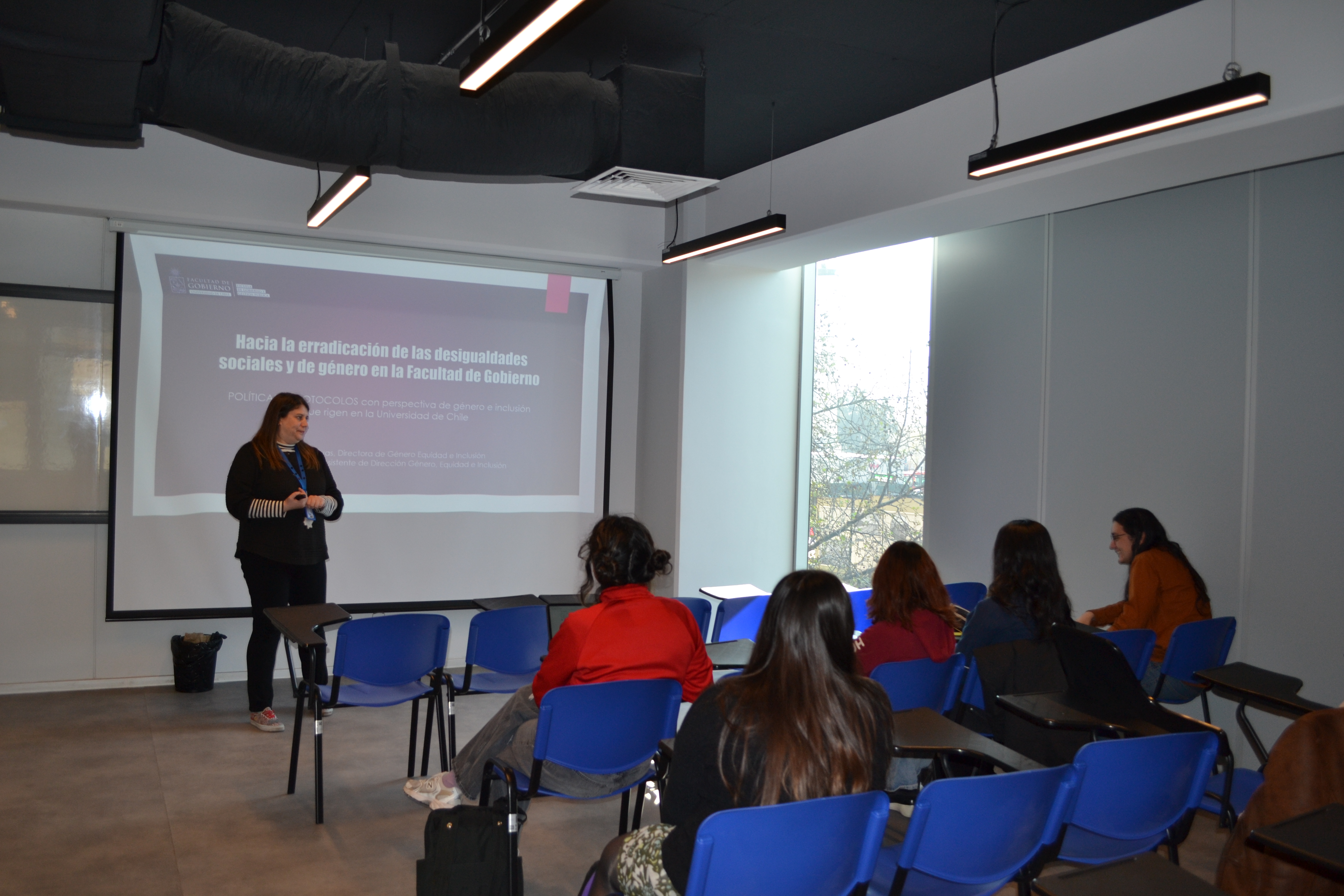 La actividad estuvo encabezada por Grettel Navas, Directora de Género, Equidad e Inclusión, junto a Marina Martínez, asistente de la dirección y Jordanna Piaggio, encargada de la unidad en pregrado, quienes presentaron las principales políticas, protocolos y lineamientos que rigen en la Universidad de Chile en materia de equidad de género, inclusión y prevención de la discriminación.