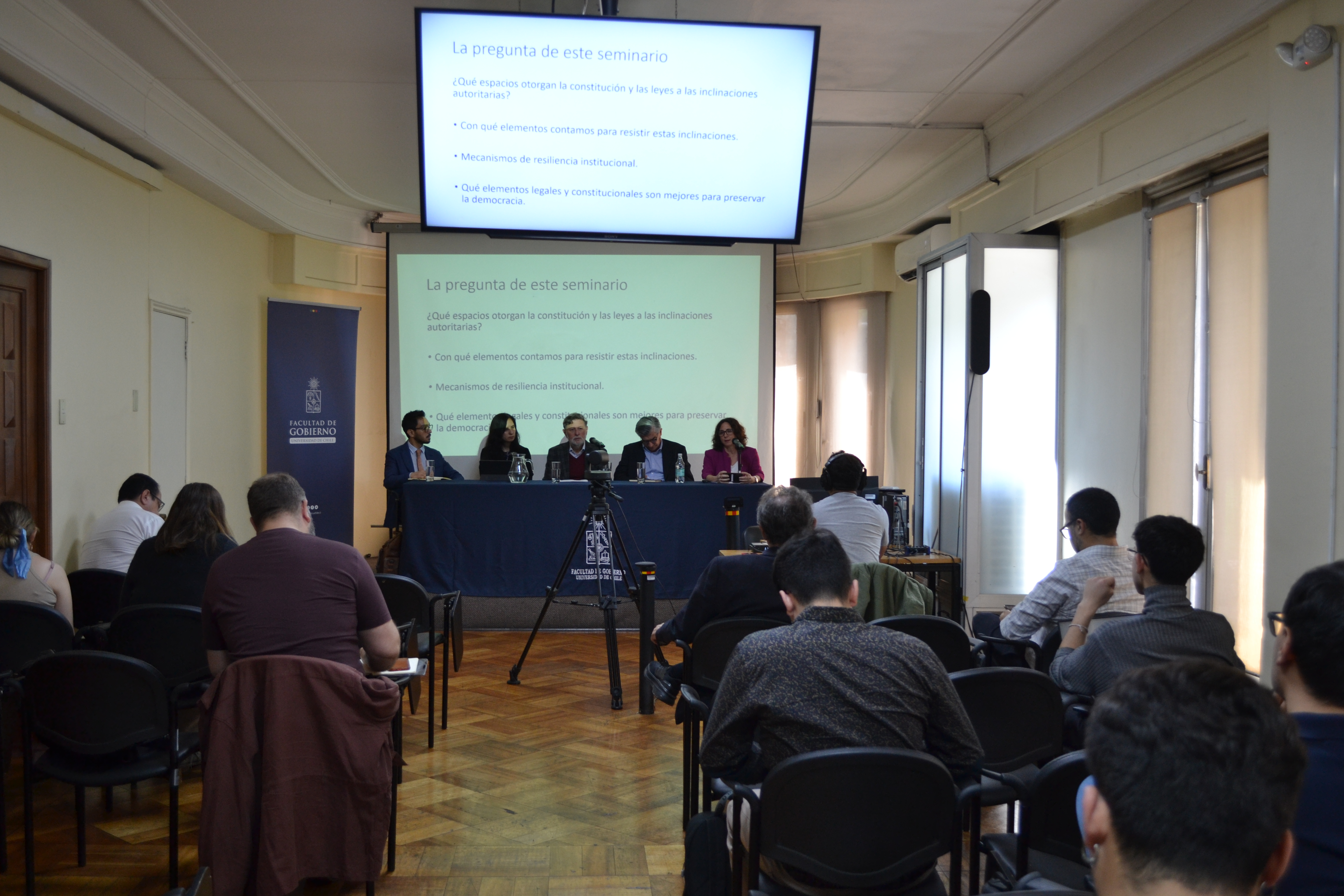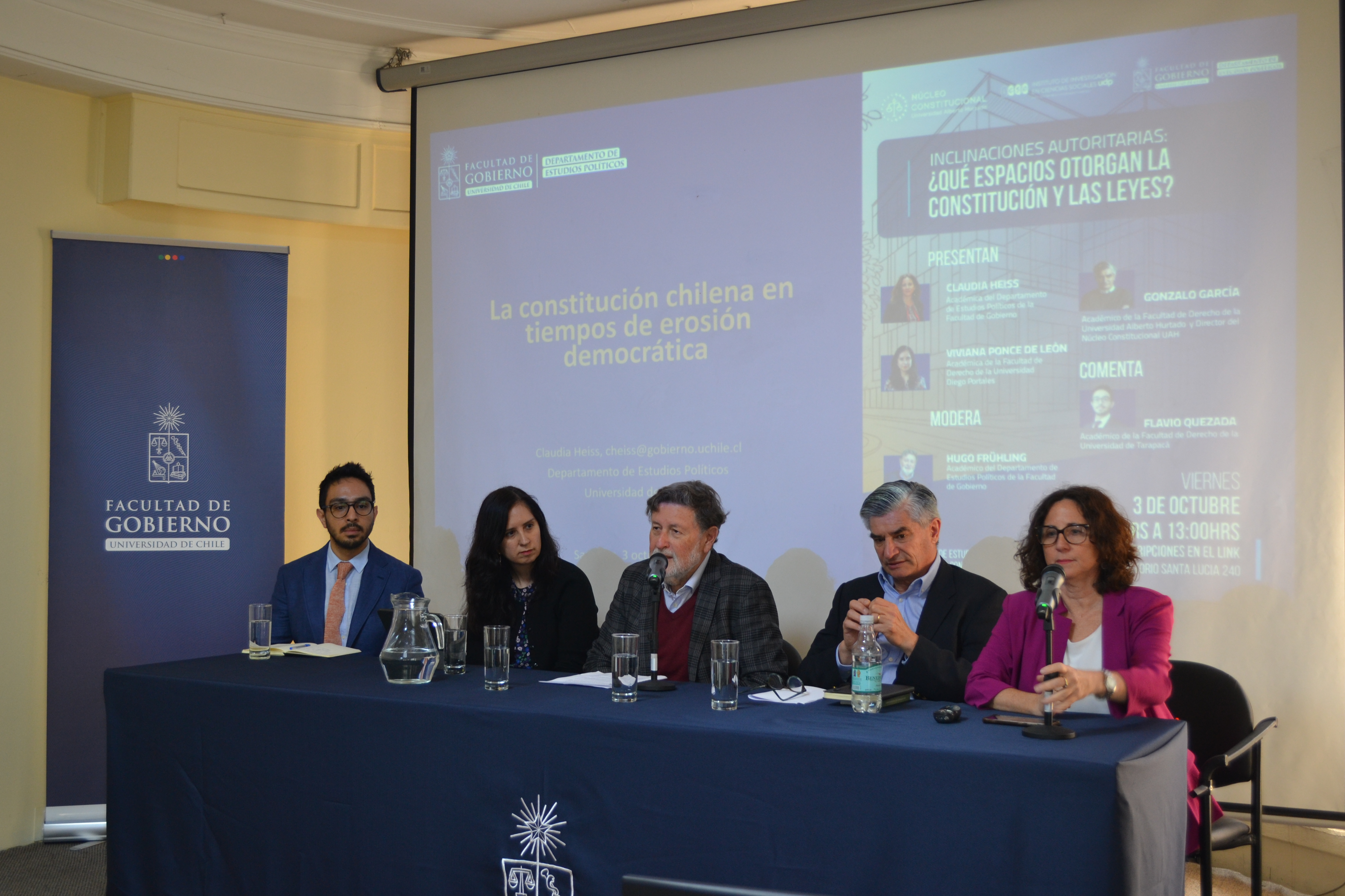 El pasado viernes 3 de octubre en el Auditorio de la sede Santa Lucía 240 de la Facultad de Gobierno, se llevó a cabo el evento “Inclinaciones autoritarias: ¿Qué espacios otorgan la Constitución y las leyes?”, que reunió a destacados cientistas políticos y constitucionalistas, quienes analizaron cómo el marco constitucional chileno puede —intencional o inadvertidamente— abrir espacio a tendencias autoritarias.