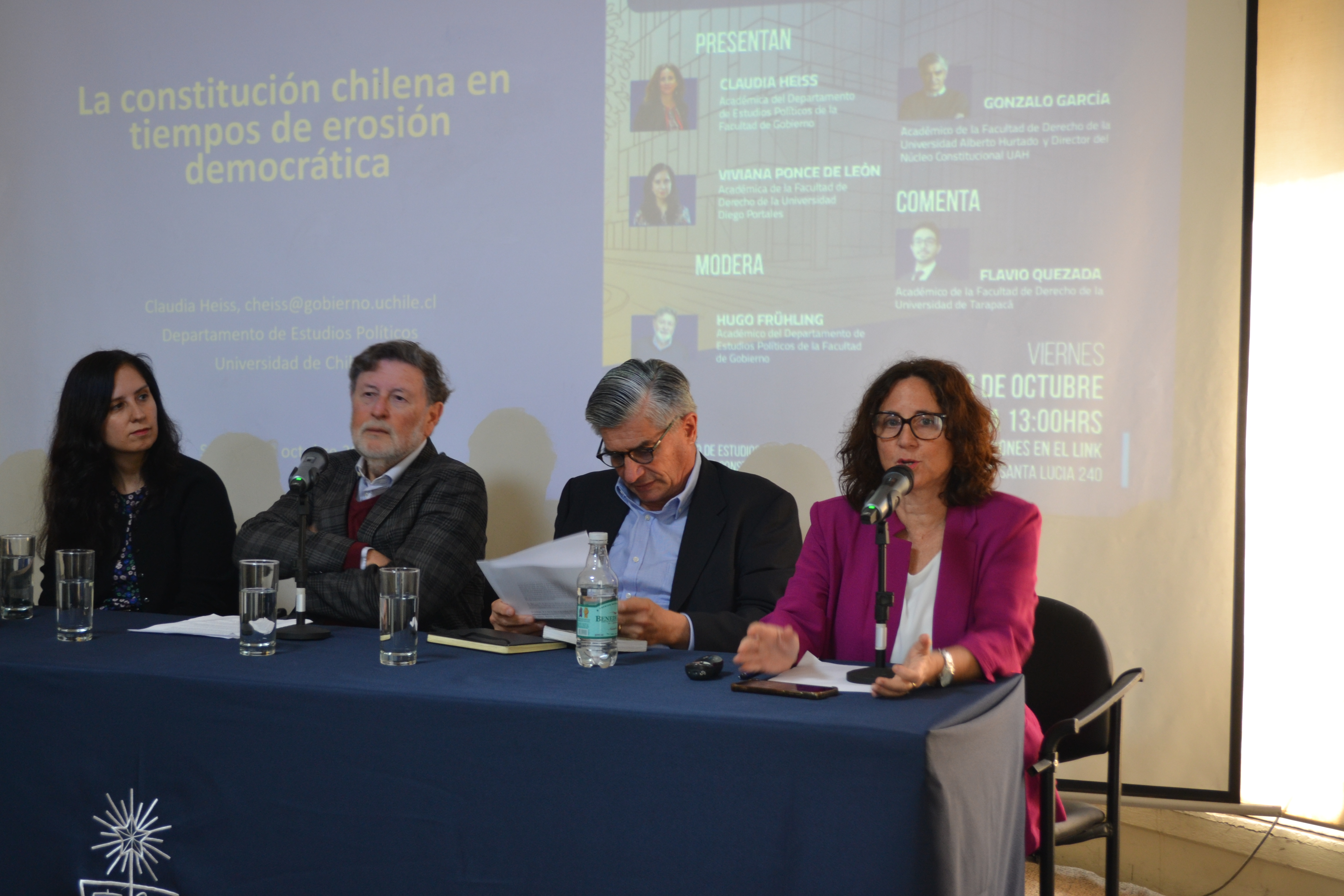 El panel estuvo integrado por Claudia Heiss, académica del Departamento de Estudios Políticos de la Facultad de Gobierno de la Universidad de Chile; Viviana Ponce de León, profesora de la Facultad de Derecho de la Universidad Alberto Hurtado; y Gonzalo García, académico de la Universidad Alberto Hurtado y exministro del Tribunal Constitucional. La conversación fue moderada por Hugo Frühling, académico de la Facultad de Gobierno, y contó con los comentarios de Flavio Quezada, profesor de la Universidad de Tarapacá y exintegrante de la Comisión Experta del proceso constitucional 2023.
