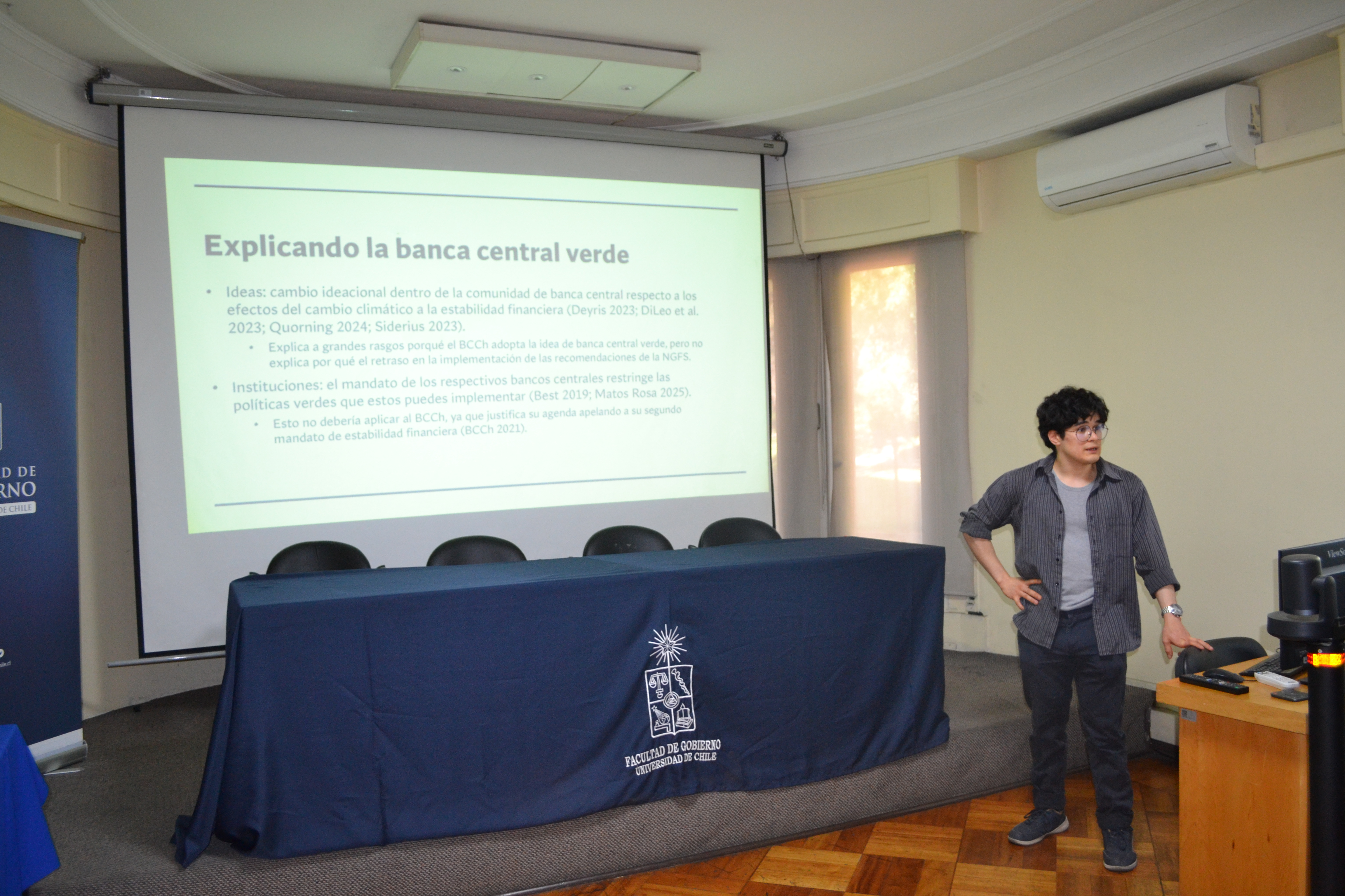 Luego fue el turno de Clemente Segovia, también cientista político y estudiante del Magíster en Ciencia Política, quien presentó su tesis sobre el giro “verde” de los bancos centrales. Su investigación analiza cómo estas instituciones han incorporado criterios ambientales, sociales y de gobernanza (ESG) en sus decisiones, con énfasis en el caso chileno, donde el Banco Central se caracteriza por su autonomía frente al gobierno, a diferencia de otros contextos internacionales.