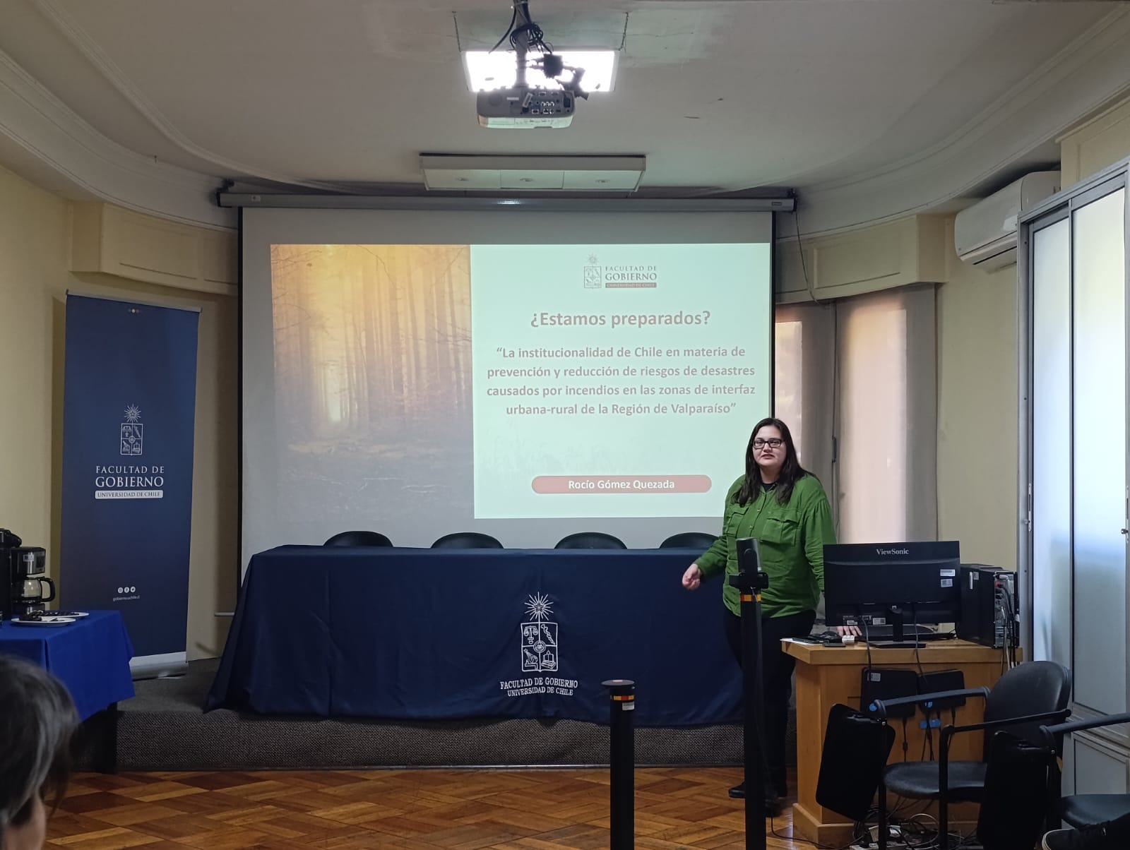 Finalmente, Rocío Gómez, administradora pública y estudiante del Magíster en Gobierno y Gerencia Pública, compartió los resultados de su investigación de pregrado sobre la gestión de desastres naturales en Chile, con foco en la Región de Valparaíso. Su estudio examina por qué esta zona se ha visto especialmente afectada por incendios forestales, destacando diversos condicionantes socio-naturales: la coexistencia entre asentamientos humanos y ecosistemas vegetales, la deficiente gestión del uso del suelo y las condiciones socioeconómicas de la población.