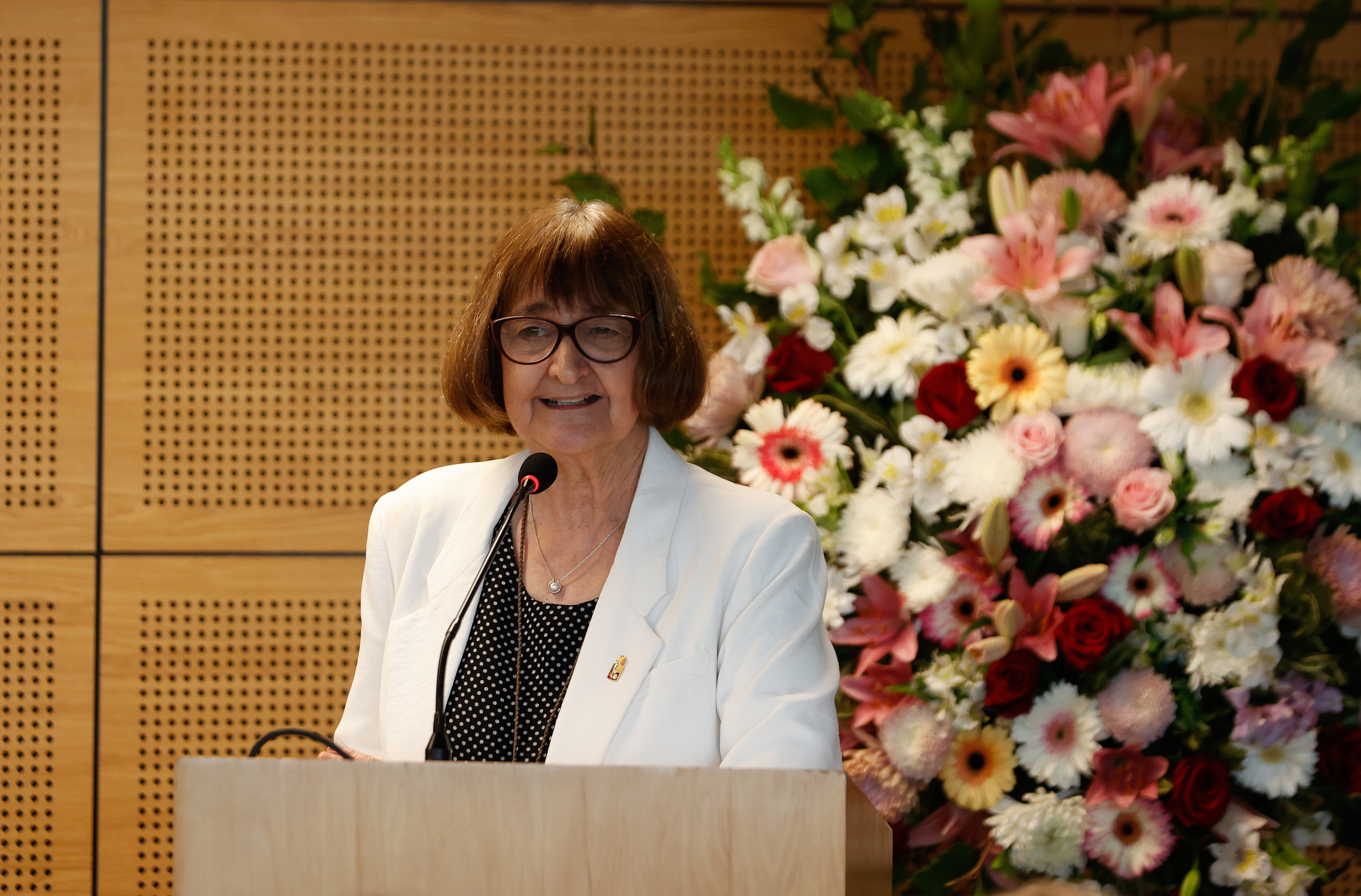 La Rectora Rosa Devés destacó la importancia de los funcionarios: "Tengo la convicción de que sin ustedes, sin lo que ustedes representan y sin quienes permanecen en la Universidad por tanto tiempo, no habría nada de lo demás. Esta ceremonia y este reconocimiento es muy importante, pues está en el corazón de nuestra institución".