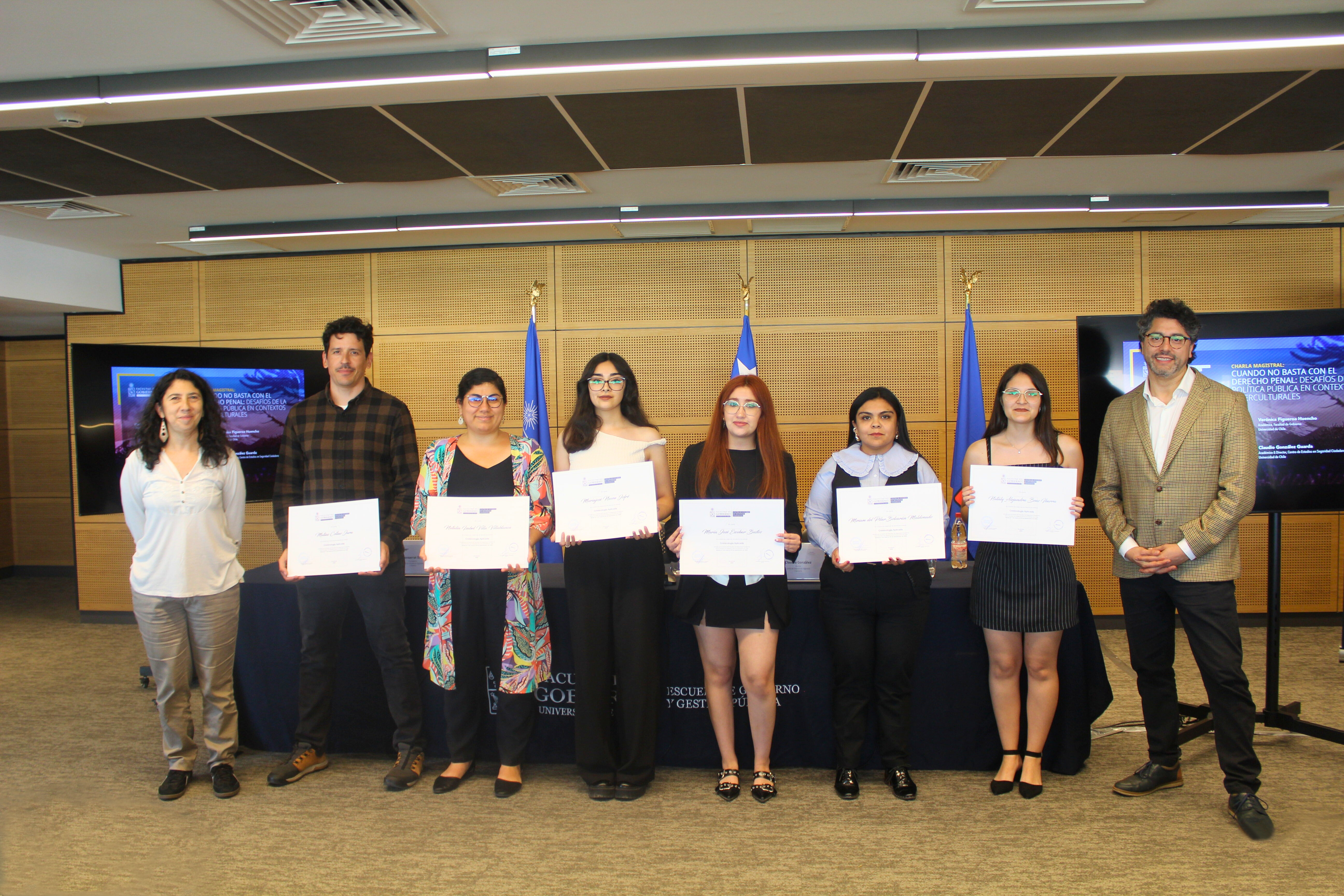 La jornada incluyó una charla magistral de la académica de la Facultad de Gobierno, Verónica Figueroa Huencho, titulada “Cuando no basta con el derecho penal: desafíos de la política pública en contextos interculturales”, donde se abordaron los límites de las respuestas punitivas tradicionales frente a conflictos territoriales y sociales que involucran a los pueblos originarios.