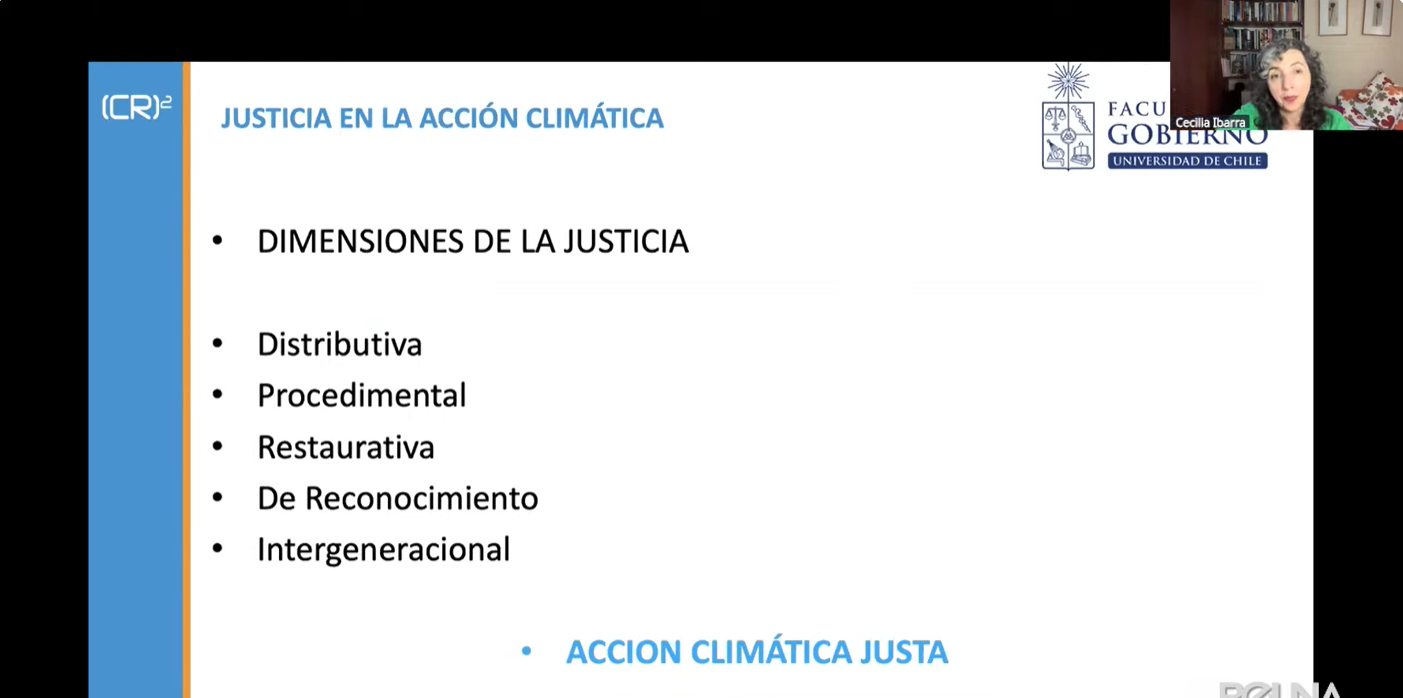 Al profundizar en este concepto, la académica explicó que la acción climática justa debe cumplir con diversas dimensiones. En primer lugar, debe ser distributiva, asegurando una distribución equitativa de los costos y beneficios de las acciones climáticas. En segundo término, debe ser procedimental, garantizando la participación efectiva de las personas afectadas en el diseño, implementación y resultados de dichas acciones. Asimismo, debe ser restaurativa, reconociendo y compensando a quienes han sufrido los impactos del cambio climático. Finalmente, debe ser intergeneracional, incorporando a las nuevas generaciones como un grupo de interés relevante en los procesos de toma de decisiones.